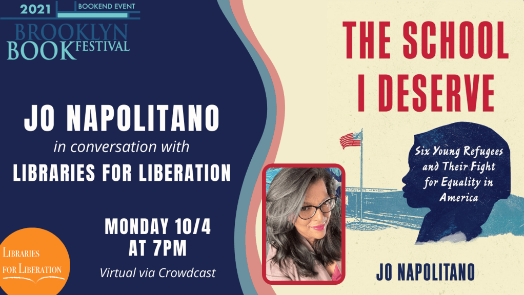 Libraries for Liberation facilitated a Brooklyn Book Festival event with award-winning journalist Jo Napolitano as she discussed her debut book, The School I Deserve: Six Young Refugees and Their Fight for Equality in America. In conversation with our team, Napolitano shared the story of the groundbreaking ACLU lawsuit in 2016 that helped shape the access refugee children have to public education. Jo’s work as a journalist speaks to our belief in the power of the written word to educate, challenge, and change hearts.